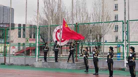 早晨7时整,升旗仪式正式开始。迎着春日的骄阳,校国旗班的护旗手们着装整齐、步伐矫健,护送鲜艳的五星红旗走向国旗台。伴随着嘹亮的《义勇军进行曲》,全场师生庄严肃立,向国旗敬礼,五星红旗冉冉升起,迎风飘扬,雄壮的国歌声响彻校园上空。